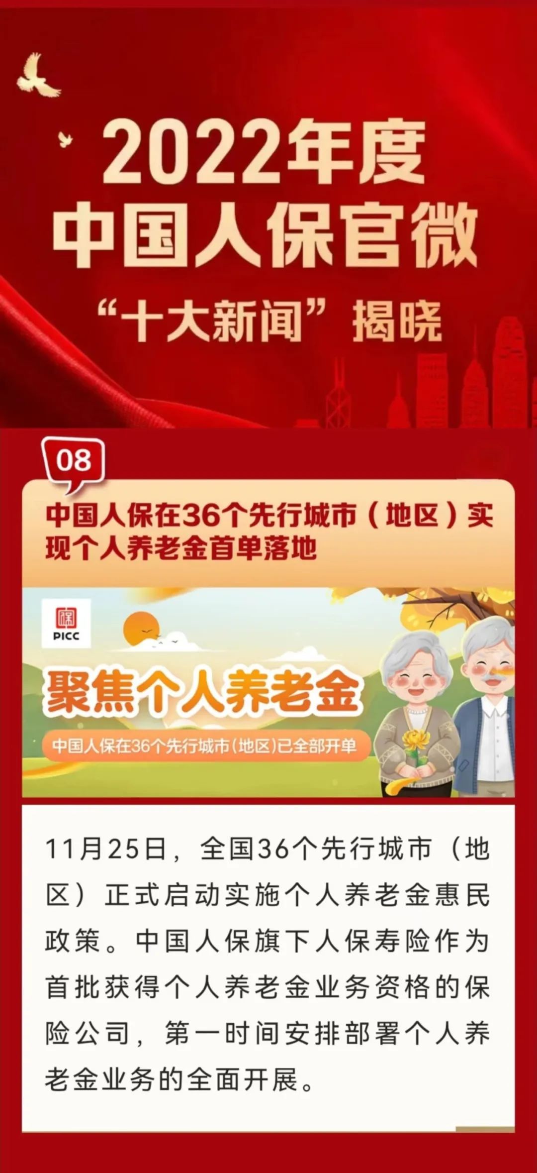2023年1月20日,在中国人民保险集团揭晓的2022年度中国人保官微“十大新闻”中,人保寿险凭借《中国人保在36个先行城市(地区)实现个人养老金首单落地》上榜集团十大新闻。