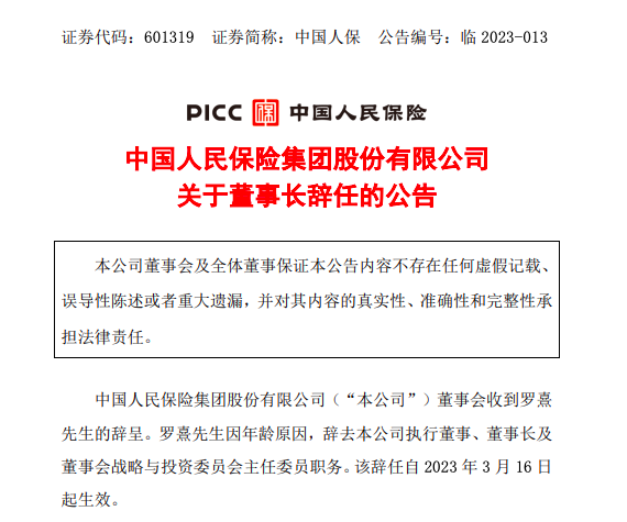 中国人保3月17日晚发布公告称,罗熹因年龄原因,辞去公司执行董事、董事长及董事会战略与投资委员会主任委员职务。该辞任自2023年3月16日起生效。