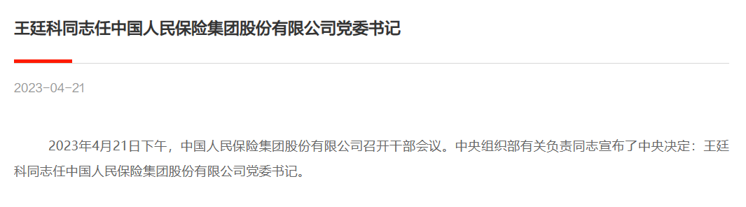 中国人民保险集团网站4月21日消息,2023年4月21日下午,中国人民保险集团股份有限公司召开干部会议。中央组织部有关负责同志宣布了中央决定:王廷科同志任中国人民保险集团股份有限公司党委书记。