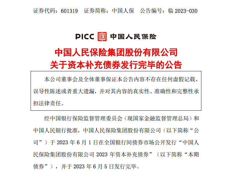 6月5日,中国人民保险集团股份有限公司(以下简称“中国人保”)发布公告称,中国人保于6月1日在全国银行间债券市场公开发行“中国人民保险集团股份有限公司2023年资本补充债券”,并于6月5日发行完毕。