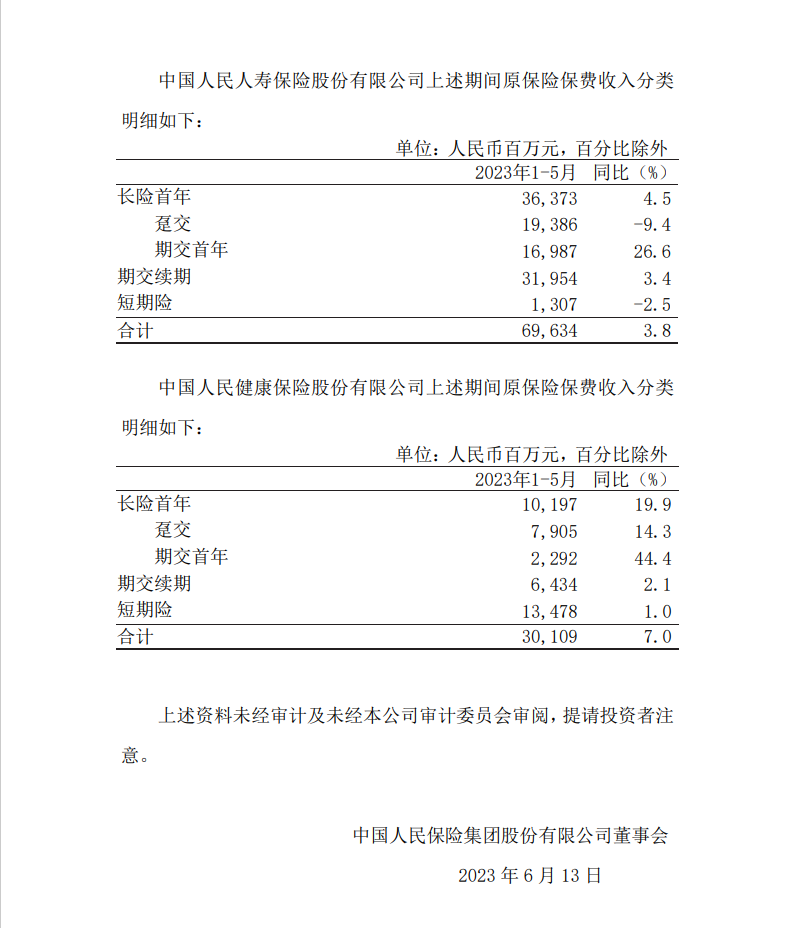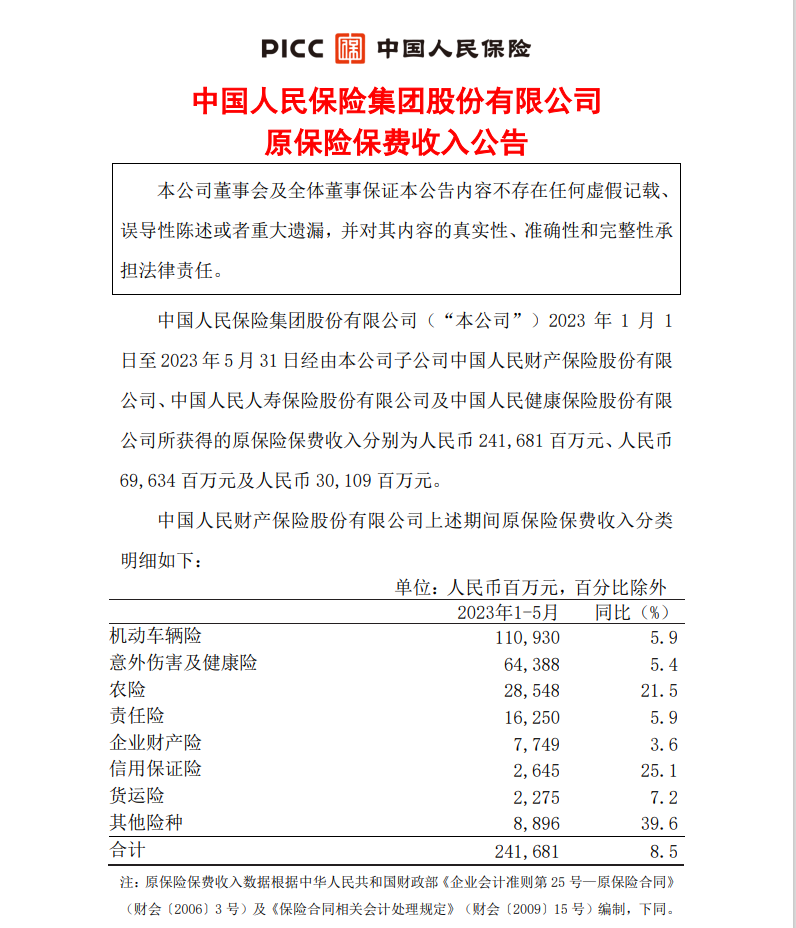 近日,中国人民保险集团股份有限公司原保险保费收入公告发布。公告显示,中国人民保险集团股份有限公司2023年1月1日至2023年5月31日经由子公司所获得的原保险保费收入共3414.24亿元。