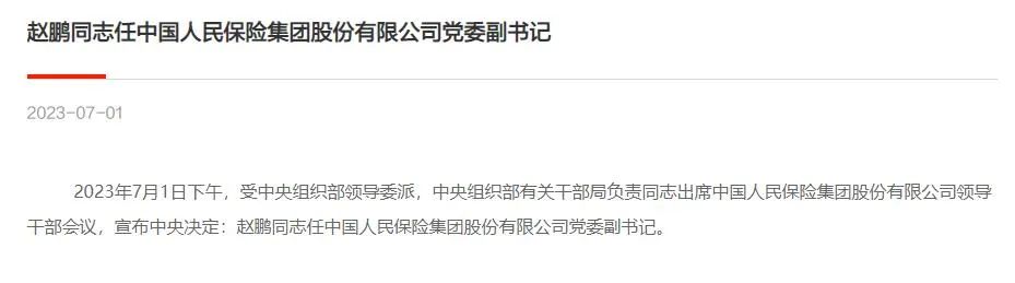 中国人保官网7月1日发布消息称,2023年7月1日下午,受中央组织部领导委派,中央组织部有关干部局负责同志出席中国人民保险集团股份有限公司领导干部会议,宣布中央决定:赵鹏同志任中国人民保险集团股份有限公司党委副书记。