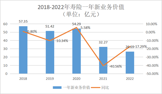 从新业务价值方面看,人保寿险与已发布年度财报的其他上市寿险公司遇到同样困境。2022年其一年新业务价值26.69亿元,同比下降17.29%,自2021年大幅下降后再次大降,新业务价值仅有2020年的一半。