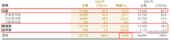 其中,寿险、健康险、意外险均出现下滑,占公司原保险保费收入超八成的寿险保费收入下降16.9亿元,同比下滑2.2%;健康险、意外险分别下降12.3%、19.4%。