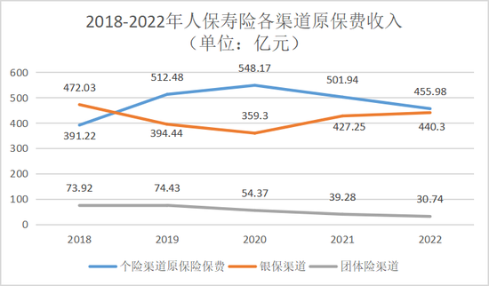 不过,从渠道保费收入来看,人保寿险保费下降主要因为高价值个险渠道保费收入的下滑。从上图可以看出,最近两年个险渠道保费持续下滑,2020年该保费收入与银保渠道拉开近200亿元差距,但2022年底两渠道收入持平。最近两年银保渠道补位,占比不断上升,与个险渠道不相上下,两渠道分别占比51.8%、44.1%。