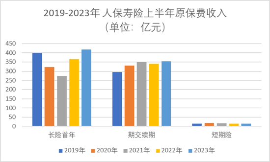 人保寿险方面两极分化比较严重,长险首年、期交续期的原保费收入远远多于短期险。人保寿险长险首年于2021年下滑至谷底,开始反弹上升。今年上半年,人保寿险长险首年实现原保费收入418.68亿元,同比上升14.61%;其期交续期相对稳定,原保费规模达353.99亿元,同比上升超4%。
