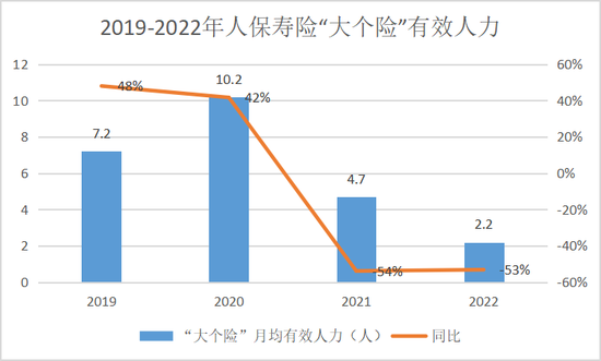 从数据来看,个险渠道保费收入下降与人力的大幅下降有密切联系。2022年其“大个险”月均有效人力约有2.2万人,2021年为4.7万人,同比下降了53%。