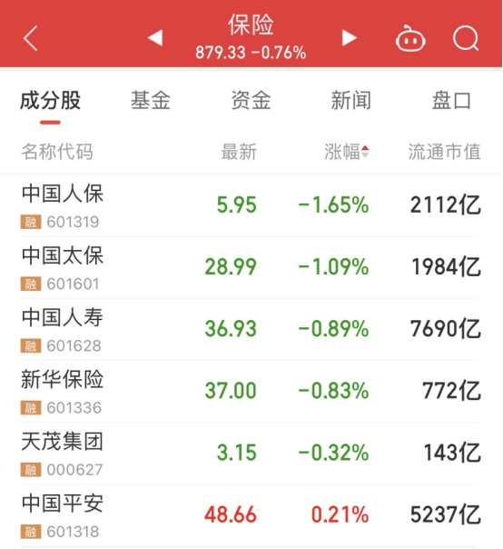 中国人保(601319.SH)今日收报5.95元,跌幅1.65%,为保险板块中跌幅最大的公司。