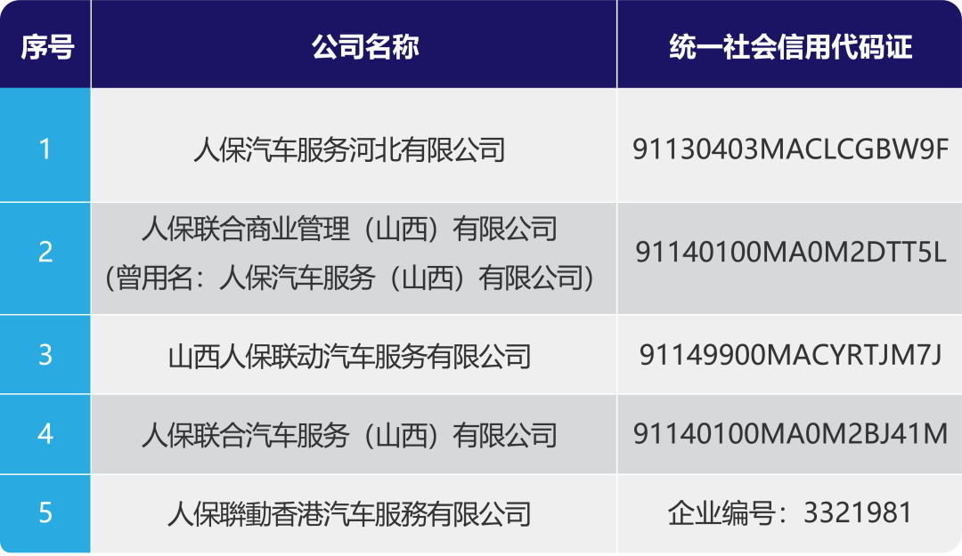 二、下列公司与中国人保及下属公司无任何隶属或股权关系,也不存在任何投资、管理、合作、业务等关系,其一切行为与中国人保及下属公司无关,如发生任何争议或纠纷,我公司不会承担任何责任。对于下列公司的不法行为,中国人保及下属公司正积极采取法律手段维护自身合法权益。