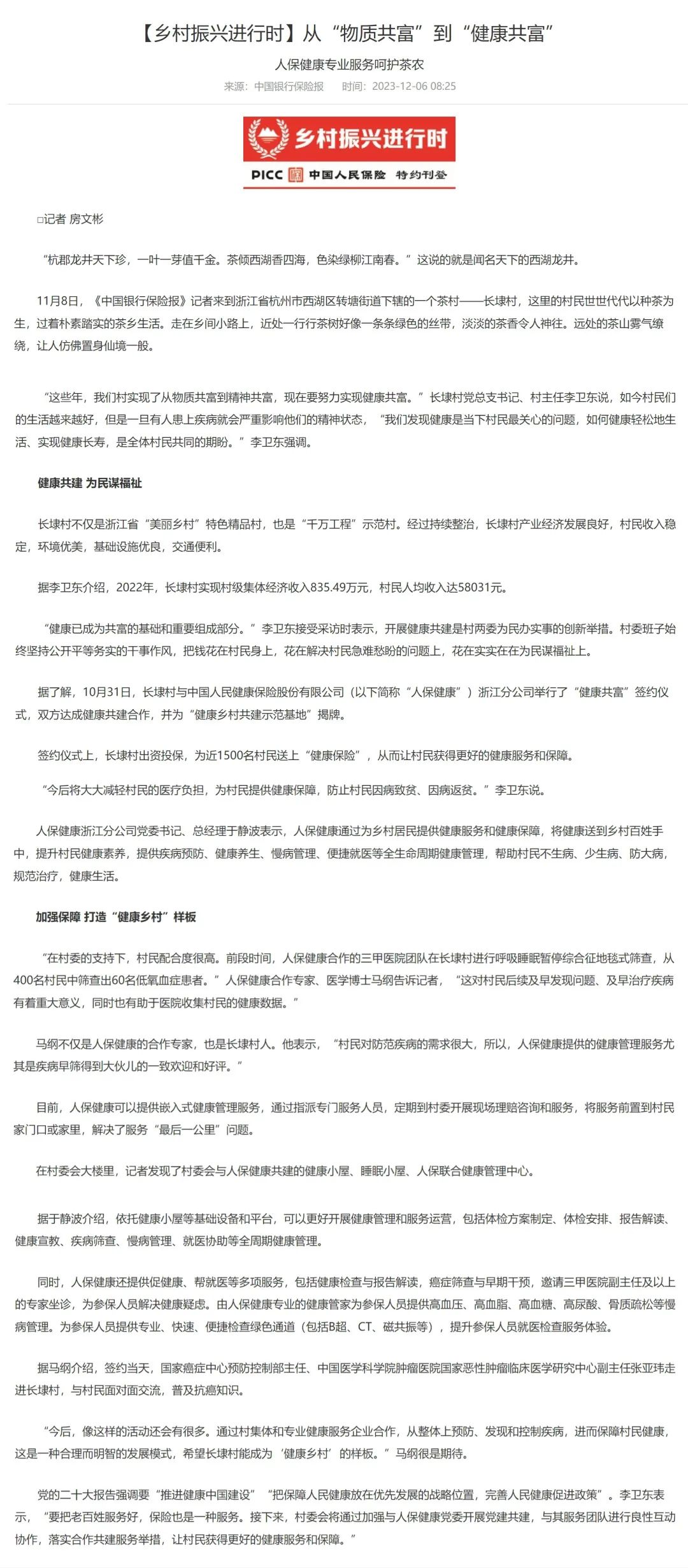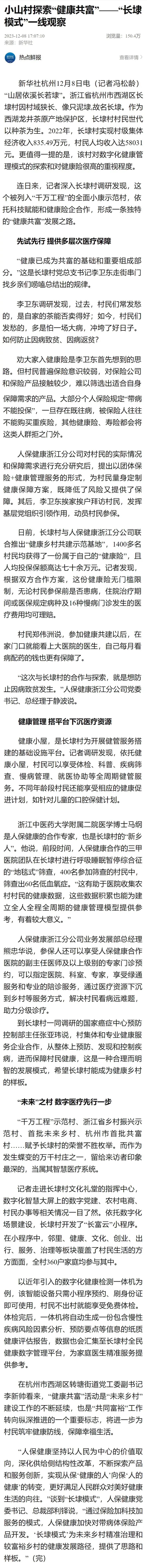 近日,新华社、中国银行保险报等多家媒体赴实地采访并相继刊发中国人保与浙江长埭村联合探索“健康乡村”新模式。