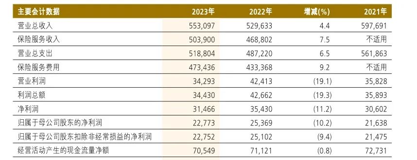理想如此丰满,但从业绩上看,中国人保的步子迈得不大,甚至回落。2023年,中国人保实现保险服务收入5039亿元,同比增长7.5%;但净利润同比下滑11.2%至314.66亿元,归母净利润同比下滑10.2%至227.73亿元。