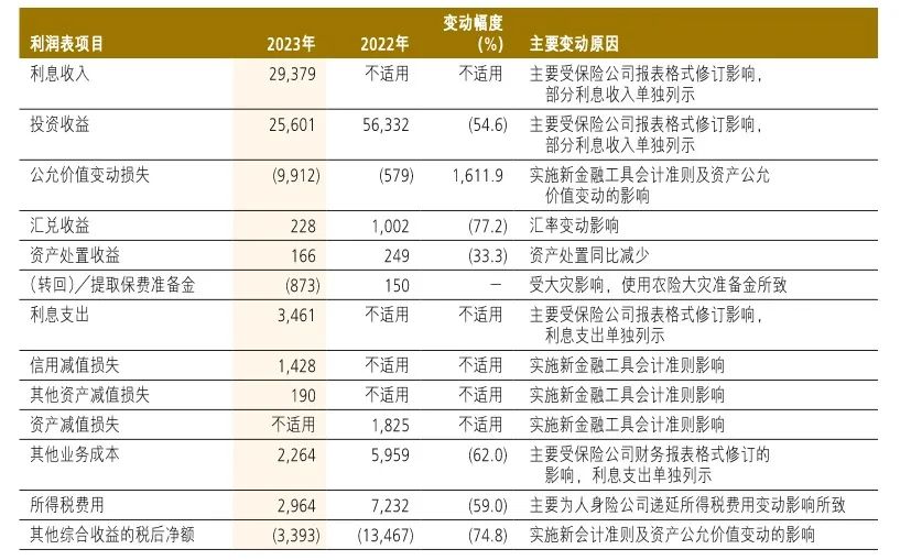 合并利润表中,中国人保的公允价值变动从2022年同期的-5.79亿元变为2023年的-99.12亿元,变动率高达911.25%。