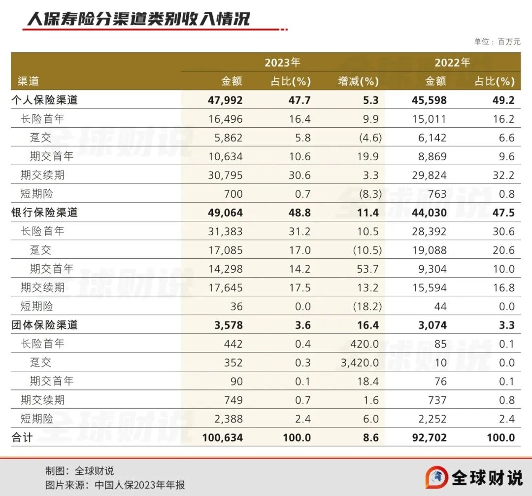 分渠道来看,目前人保寿险仍较为依赖银保渠道,2023年银行保险渠道原保险保费收入490.64亿元,占比48.8%,同比升高1.3个百分点,超过个人保险渠道的47.7%。