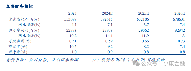 投资建议:2024Q1,公司财险保持稳健发展态势,寿险NBV实现超高增,整体负债端表现良好。受投资端影响,净利润增速承压。展望2024年,我们依旧看好公司作为财险龙头的优势,1/3市占率+不断完善的风险管理水平驱动承保盈利持续向上。当前监管趋严及去年高基数或对寿险量增长产生一定压力,但新业务价值率有望持续弥补新单增速。同时随着医疗、养老需求不断释放以及公司深耕健康管理领域,人保健康或将持续跑出亮眼业绩。我们维持2024-2026年EPS预测值为0.59/0.66/0.73元,维持财产险业务2024年PB目标值为1.1x,其他业务为1x,人身险业务PEV目标值为0.5x,对应2024年目标价为7.1元。维持公司“推荐”评级。