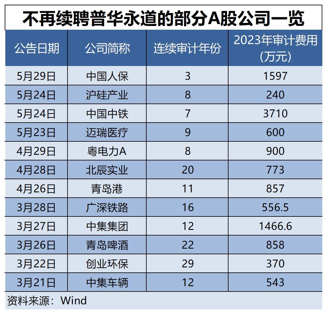 5月24日,中国中铁亦公告拟不再续聘普华永道。变更理由主要是考虑公司现有业务状况、发展需求及整体审计需要。截至2023年度,普华永道已为中国中铁提供7年审计服务。2023年,审计收费3710万元。