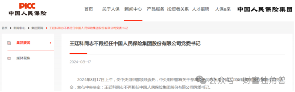 据中国人保官网信息,8月17日上午,受中央组织部领导委托,中央组织部有关干部局负责同志出席中国人保党委会,宣布中央决定,王廷科不再担任中国人保党委书记。