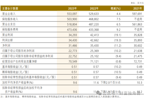 据2023年年报数据显示,全年中国人保实现营业总收入5530.97亿元,同比增长4.4%,但归属于母公司股东净利润却同比下降10.2%至227.73亿元。