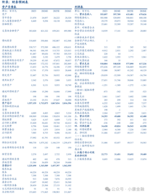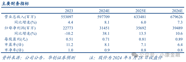 投资建议:2024H1,人保财险虽然COR受自然灾害影响小幅上行,但仍在行业保持领先地位;寿险与健康险实现NBV合计翻倍以上。展望2024年,我们依旧看好公司作为财险龙头的优势,1/3市占率+不断完善的风险管理水平驱动承保盈利持续向上。下半年寿险新单基数压力有所减弱,同时预定利率进一步下调将持续带来新业务价值率改善。随着医疗、养老需求不断释放以及公司深耕健康管理领域,人保健康或将持续跑出亮眼业绩。我们上调2024-2026年EPS预测值为0.71/0.81/0.89元(原值为0.59/0.66/0.73元),维持财产险业务2024年PB目标值为1.1x,其他业务为1x,人身险业务PEV目标值为0.5x,对应2024年目标价为7.3元。维持“推荐”评级。