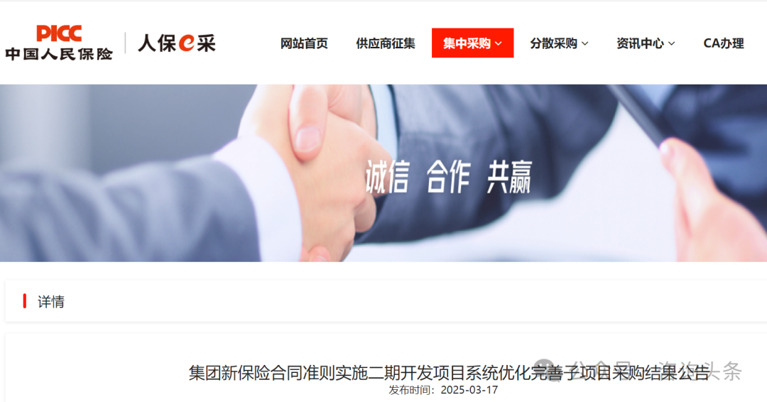 2025年3月17日,中国人保发布《集团新保险合同准则实施二期开发项目系统优化完善子项目采购结果公告》。公告显示,中选供应商为德勤管理咨询(上海)有限公司,采购方式为单一来源,采购价格(含税)为3950万元。