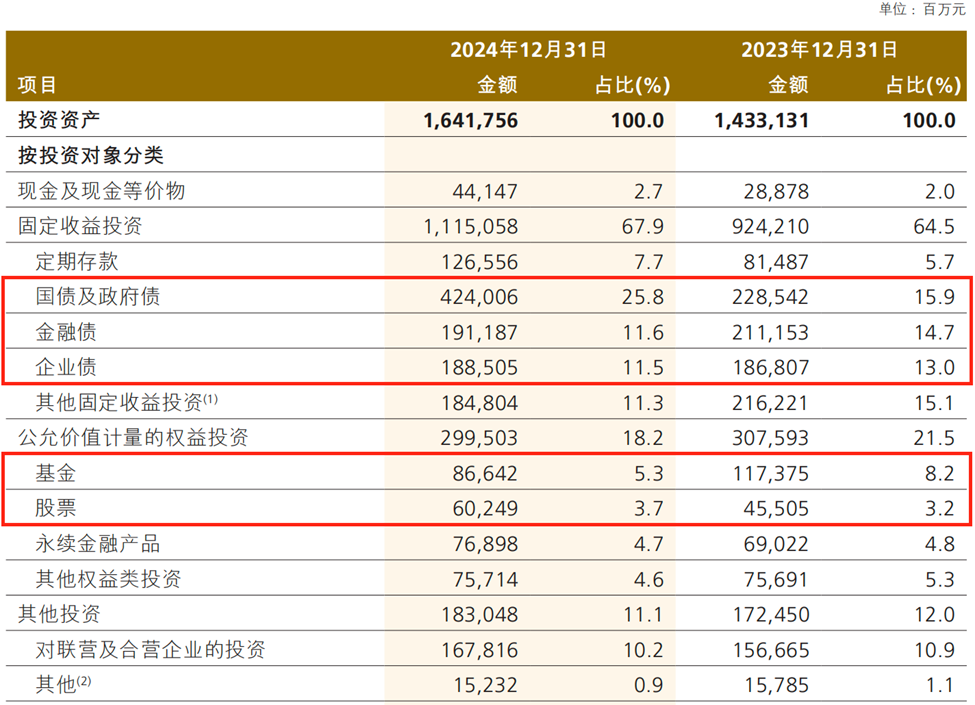 我们从报表中可以看到,中国人保2024年投资组合中,固定收益投资占比67.9%,投资总额达1.12万亿元。其中,国债及政府债投资总额达4240.06亿元,金额较2023年同期大幅增长85.53%,配置占比为25.8%;配置的金融债为1911.87亿元,同比缩减了9.46%,占比达11.6%;企业债则为1885.05亿元,同比小幅增加了0.91%,占比总投资资产的11.5%。