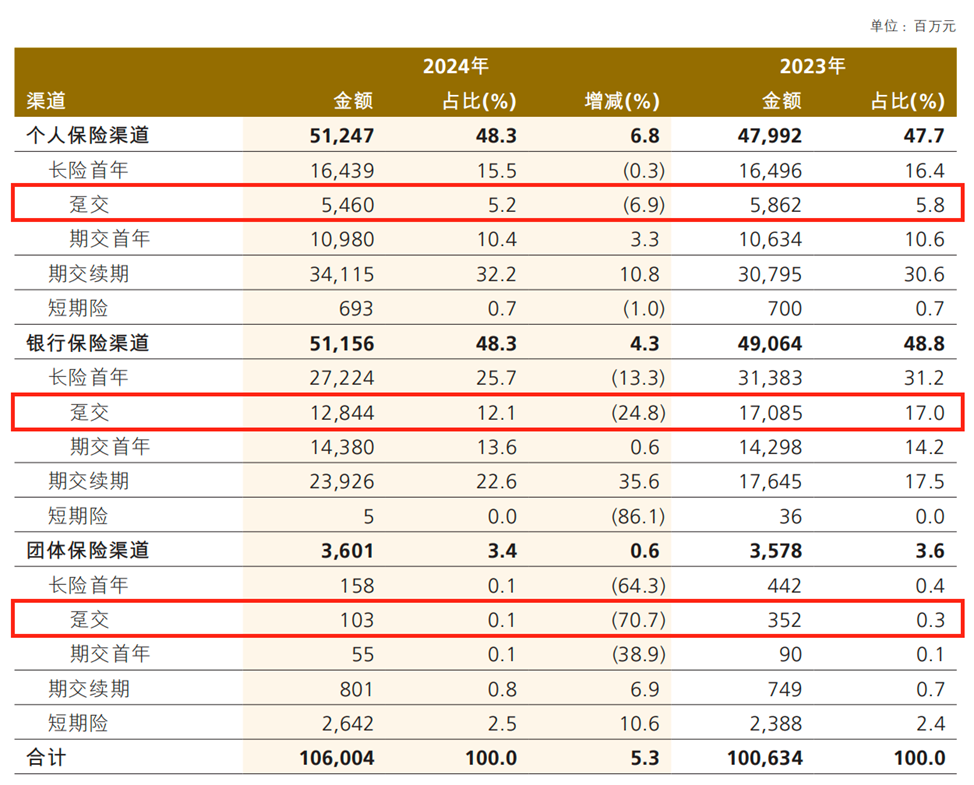 在这三大渠道中,人保寿险的保费收入主要靠续期拉动,而趸交型产品、长险首年保费均出现大幅度滑坡。2024年,人保寿险三渠道期缴续期保费分别同比增长了10.8%、35.6%、6.9%。相反,同期个险渠道、银保渠道、团险渠道的长险首年保费同比分别下降了0.3%、13.3%、64.3%,趸交型产品保费分别同比下降了6.9%、24.8%、70.7%。