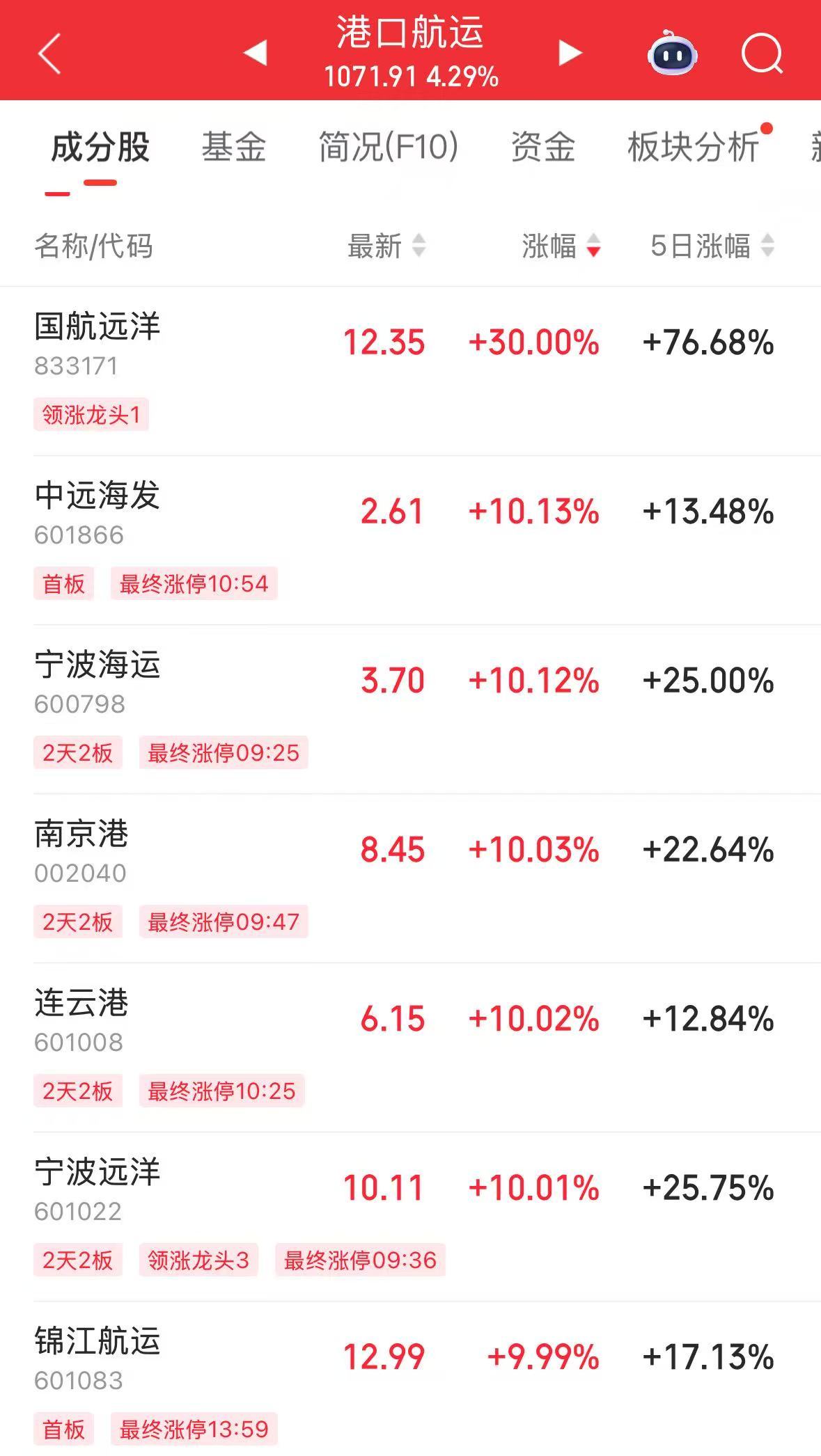 航运概念延续强势,国航远洋、宁波海运、宁波远洋、中远海发、南京港等多股涨停。