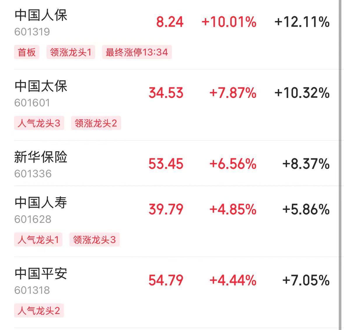 保险股爆发,中国人保涨停,创出年内新高,中国太保涨超7%,新华保险涨超6%,中国人寿、中国平安涨超4%。