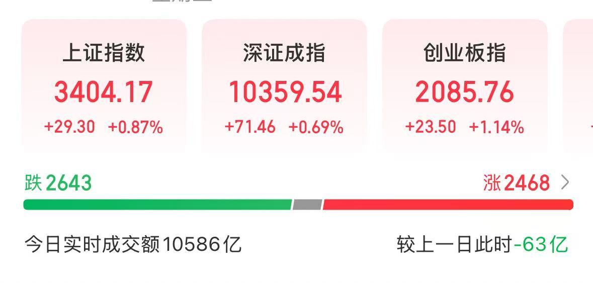 5月14日午后,A股三大指数集体走高。截至发稿前,沪指上涨0.87%,重回3400点创近2个月新高,深证成指上涨0.69%,创业板指上涨1.14%。
