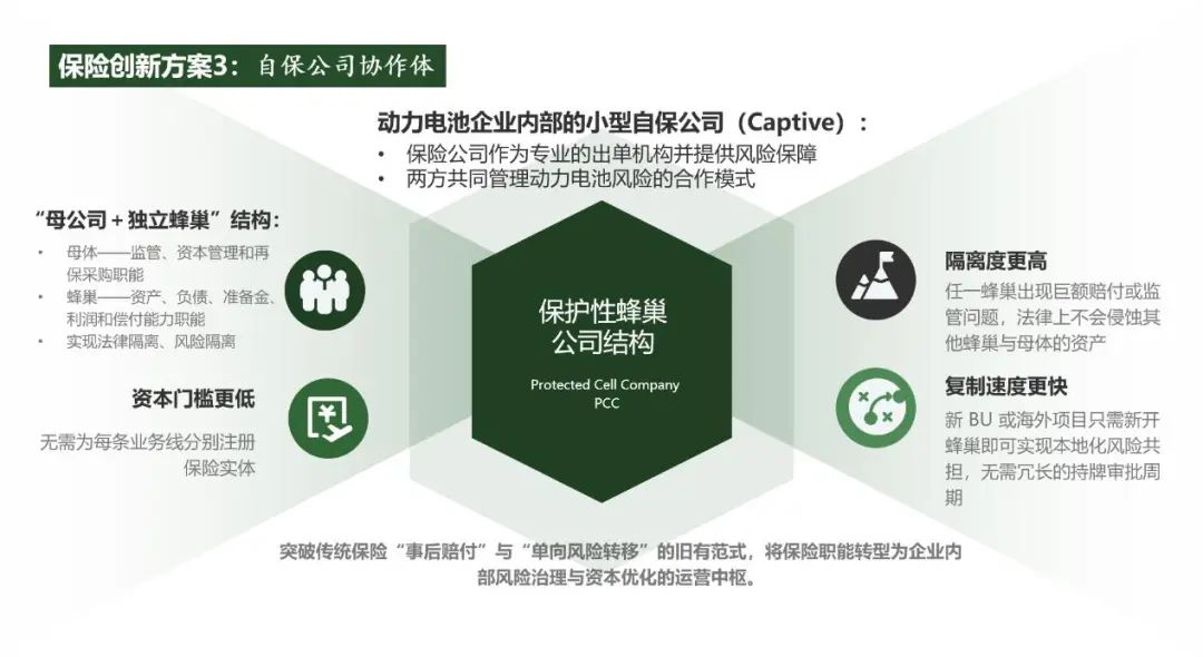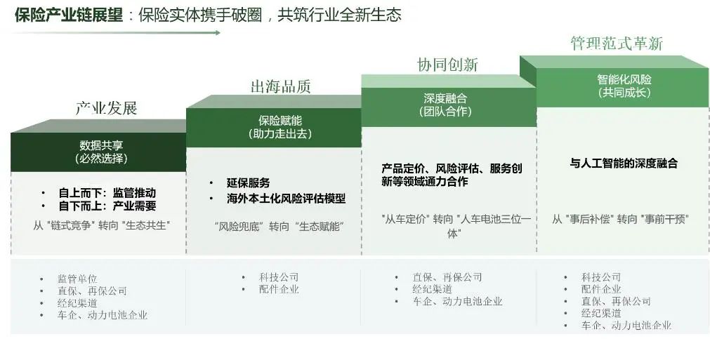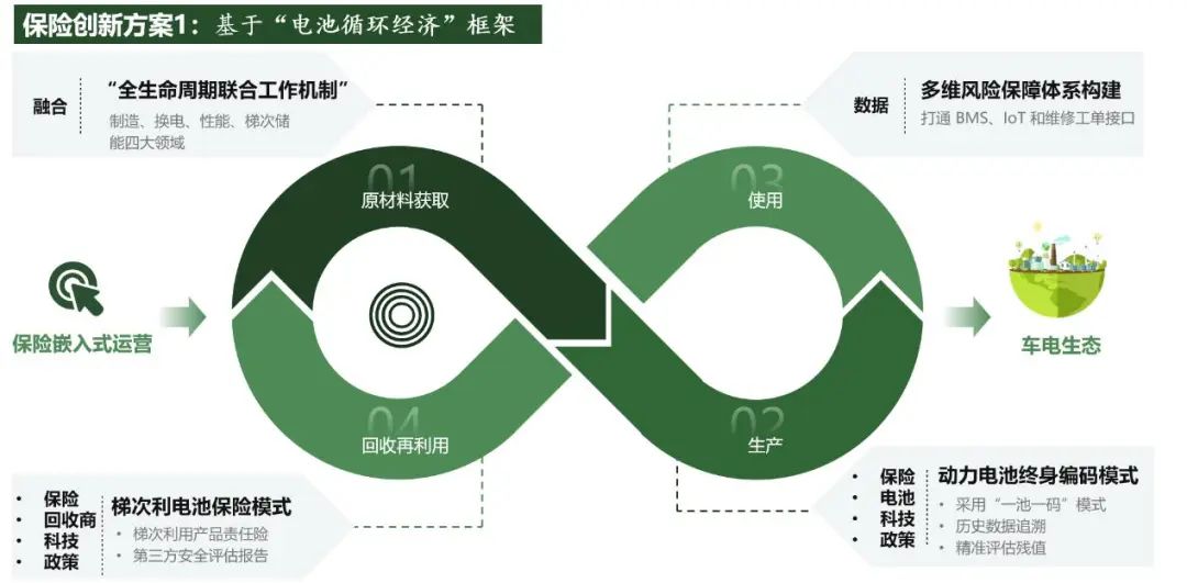 商业篇与创新篇直击行业痛点,针对“三电”保障、电池梯次利用及海外服务中存在的保险保障缺口,提出通过“直保+再保”融合模式,强化风险分担能力,并提供四大创新解决方案:“电池循环经济”保险配套模式,动力电池终身编码保险保障,基于驾驶行为的电池延保机制,以及自保公司风险共担体系,构建起“技术迭代-标准建设-保险适配”三位一体协同机制,推动产业与保险深度融合。