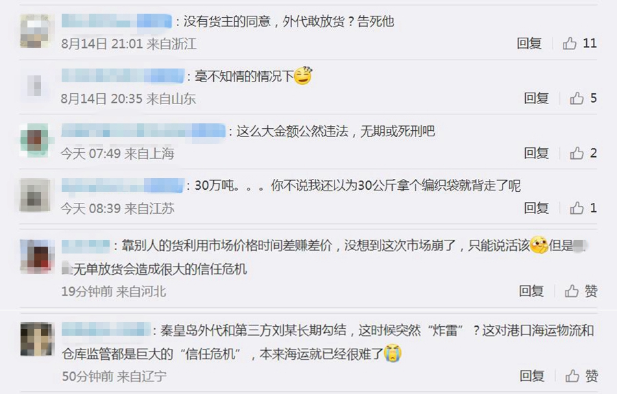 在微博,有网友表示:“没有货主的同意,外代敢放货?告死他”“30万吨。。。你不说我还以为30公斤拿个编织袋就背走了呢”。