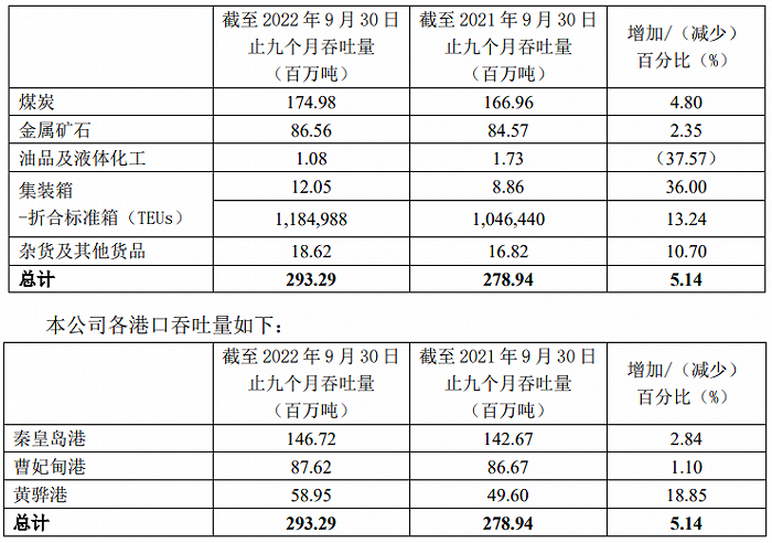 秦港股份10月17日公布2022年第三季度吞吐量,截至2022年9月30日止九个月吞吐量2.93亿吨,同比增长5.14%。其中,秦皇岛港吞吐量1.47亿吨,同比增长2.84%;曹妃甸港吞吐量8762万吨,同比增长1.10%;黄骅港吞吐量5895万吨,同比增长18.85%。