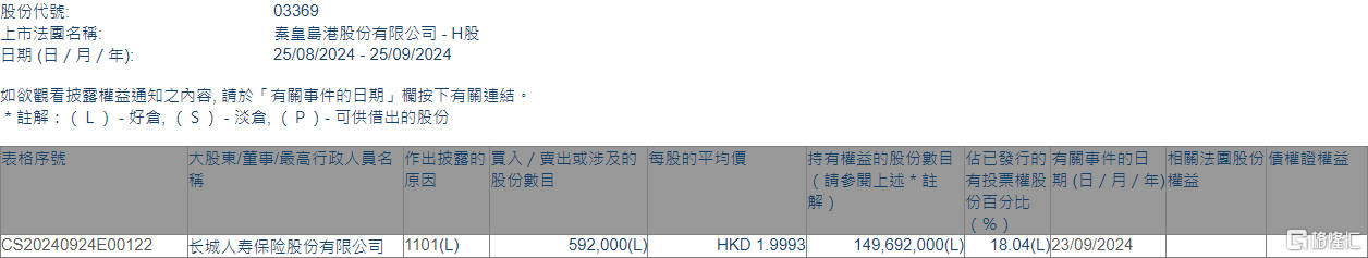 格隆汇9月25日丨根据联交所最新权益披露资料显示,2024年9月23日,秦港股份(03369.HK)获长城人寿保险股份有限公司在场内以每股均价1.9993港元增持59.2万股,涉资约118.36万港元。