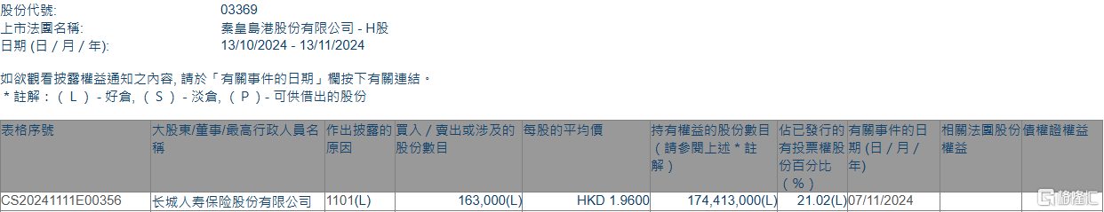 格隆汇11月13日丨根据联交所最新权益披露资料显示,2024年11月7日,秦港股份(03369.HK)获长城人寿保险股份有限公司在场内以每股均价1.96港元增持16.3万股,涉资约31.95万港元。