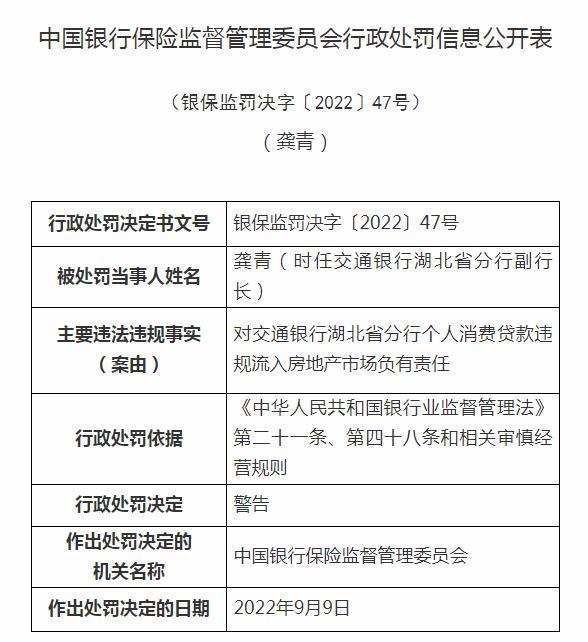 此外,根据《中华人民共和国银行业监督管理法》及相关审慎经营规则,时任交通银行湖北省分行副行长龚青因对交通银行湖北省分行个人消费贷款违规流入房地产市场负有责任,被银保监会处以警告。