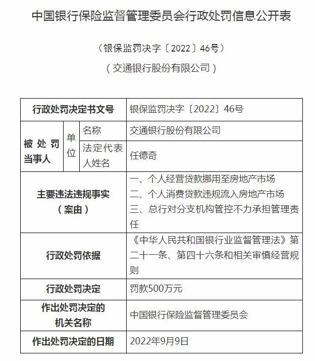 具体来看,行政处罚信息表显示,交通银行因个人经营贷款挪用至房地产市场;个人消费贷款违规流入房地产市场;总行对分支机构管控不力承担管理责任,根据《中华人民共和国银行业监督管理法》第二十一条、第四十六条和相关审慎经营规则,被处以罚款500万元。