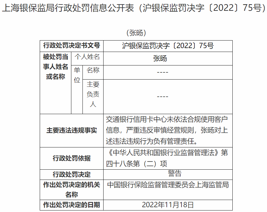 近日,银保监会上海监管局公布一则处罚信息,交通银行信用卡中心因信用卡业务违规被警告,作出处罚决定的日期是2022年11月18日。
