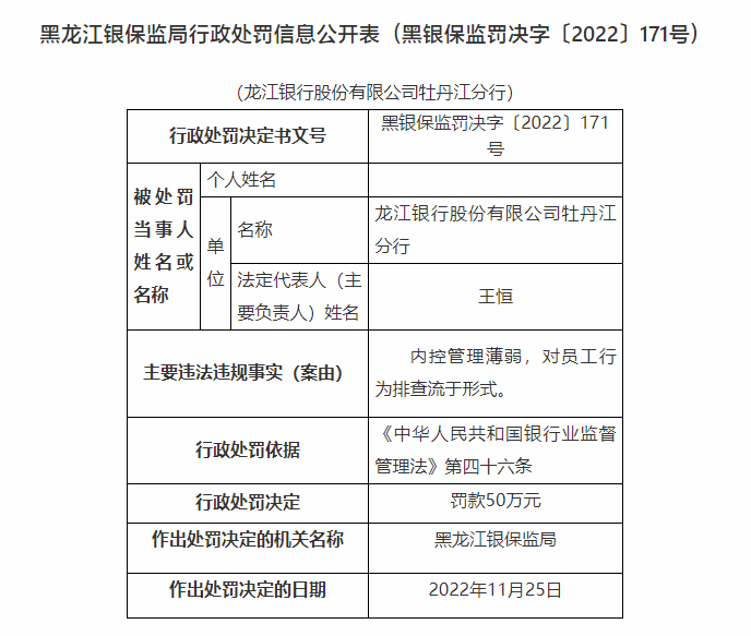 11月29日,银保监会官网发布《黑龙江银保监局行政处罚信息公开表(黑银保监罚决字〔2022〕171号)》显示,龙江银行牡丹江分行因内控管理薄弱,对员工行为排查流于形式被罚50万元。