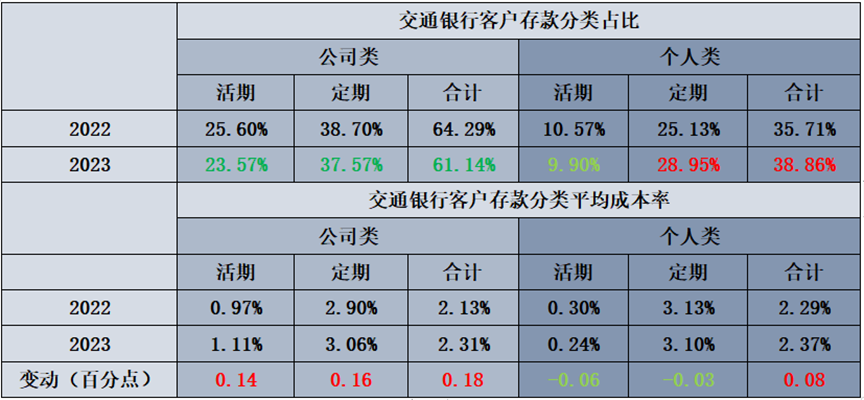 (1)公司类客户平均成本全面提升。2023年,交通银行公司类客户存款平均成本提升0.18个百分点至2.31%,其中活期提升0.14个百分点、定期提升0.16个百分点;