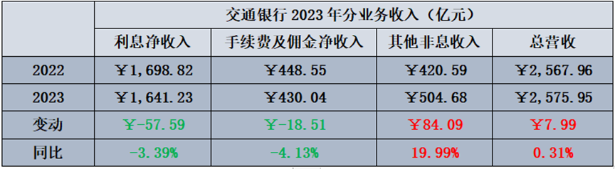 2023年,交通银行营业收入为2575.95亿元,在经过2022年的小幅调整后重归增长;收入结构上,“利息净收入”占比较2022年下降2.44个百分点至63.71%;整体业绩稳中有进主要受益于“非利息净收入”的强劲增长,该业务弥补了超6成传统业务的下滑的同时,拉动交通银行2023年营收同比实现0.31%的增长。