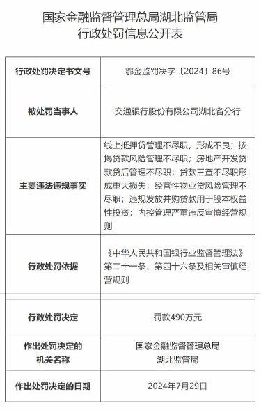 7月29日,金融监管总局湖北监管局决定对交通银行湖北省分行罚款490万元,且对11位相关责任人进行了处罚。主要原因包括:线上抵押贷管理不尽职,形成不良;按揭贷款风险管理不尽职;房地产开发贷款贷后管理不尽职;贷款三查不尽职形成重大损失;经营性物业贷风险管理不尽职;违规发放并购贷款用于股本权益性投资;内控管理严重违反审慎经营规则。