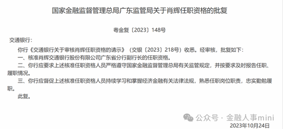 去年10月肖辉刚获批交行广东省分行副行长职务。