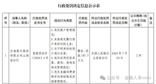 在刚刚过去的7月,据央行山西省分行公布的行政处罚信息,交通银行山西省分行因违反信用信息采集、提供、查询及相关管理规定等,被警告并罚款107.7万元,6名相关责任人也被罚。