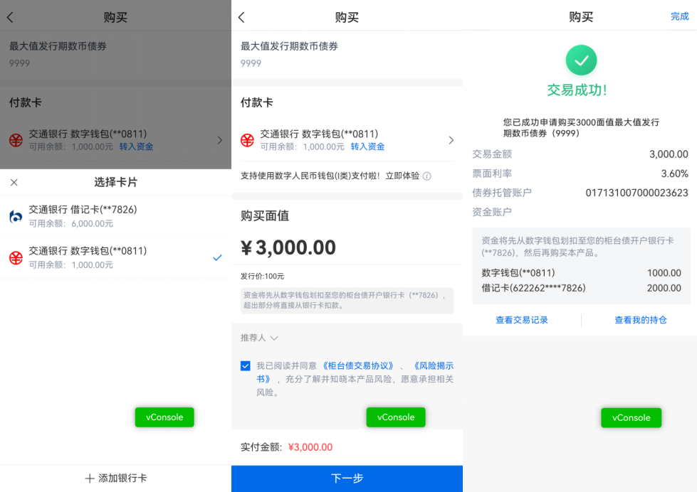 2024年5月21日至23日上海债发行期3天内,共有36笔交易客户使用数币钱包支付,购买总金额超1436万元,其中26笔交易都使用了数币钱包与银行卡联合支付,且数币钱包的支付金额占总交易金额超61%,可见增加数币钱包支付功能较大程度满足了客户银行卡内余额不足的联合支付诉求。