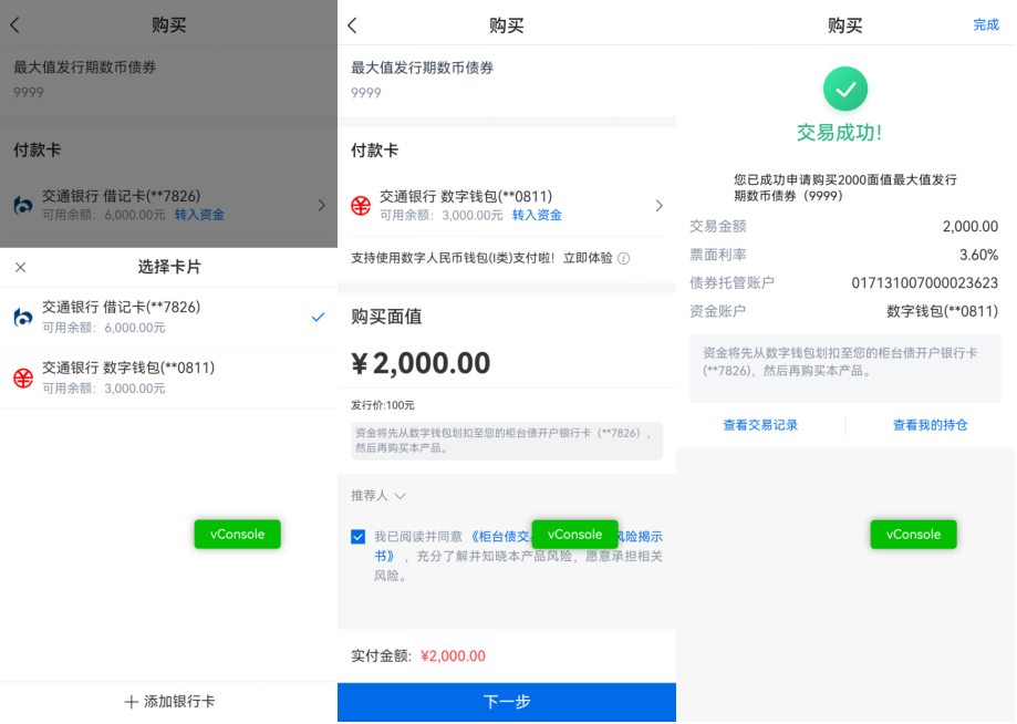 若客户的购买面值超过数币账户余额,但是不超过数币账户余额和托管账户银行卡余额的总值,购买页输入框下提示“资金将先从数字钱包划扣至您的柜台债开户银行卡,超出部分将直接从银行卡扣款”,客户后续支付成功后,购买结果页将展示本次交易实际的数币钱包扣款金额、银行卡扣款金额。