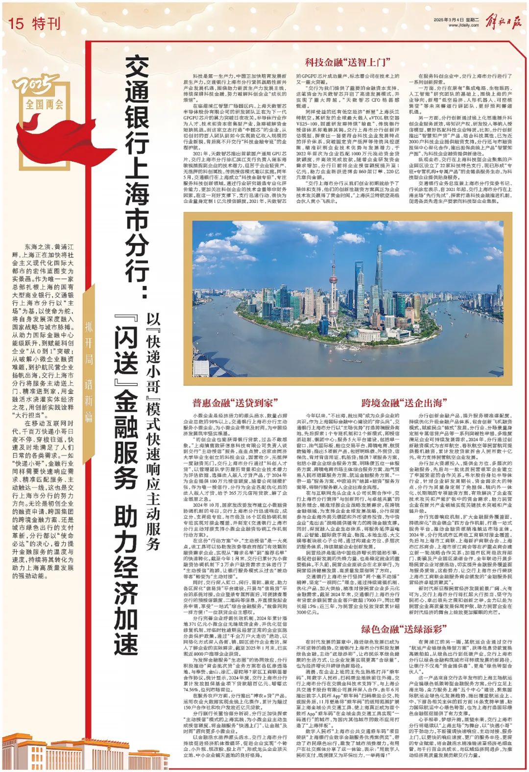 3月4日,《解放日报》2025全国两会特刊刊发《交通银行上海市分行:“闪送”金融服务助力经济加速》报道,介绍交行上海市分行深耕主场,将自身发展深度融入国家战略与城市脉搏,用金融活水浇灌实体经济之花,为推动经济高质量发展贡献交行力量。
