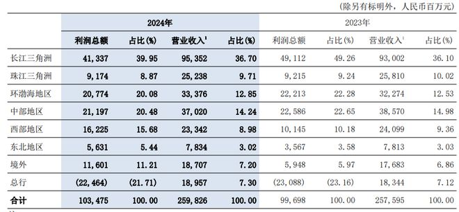 南都·湾财社记者注意到,“做优做强上海主场”被交通银行放在了工作任务前排。财报显示,2024年,交通银行在长三角地区收入953.52亿元,同比增长2.5%,占交通银行总营收比例36.7%,是交通银行“主粮仓”;此外,交通银行去年在环渤海、东北和境外收入同样实现增长,但在珠三角、中部、西部地区收入同比分别下滑2.2%、4%、3.1%。