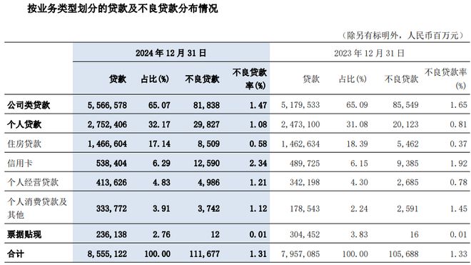 个人贷款方面,该行信用卡不良率达2.34%,较上一年末上升42BP;截至去年末,该行信用卡逾期贷款285.22亿元,逾期贷款率达5.3%。此外,该行住房贷款、个人经营贷不良率较上年末分别上行21BP、43BP至0.58%、1.21%;个人消费贷及其他不良率较上年末下降33BP至1.12%。