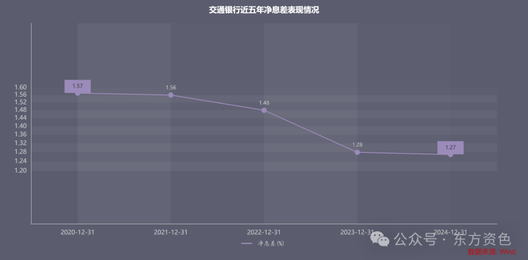 同时,数据显示,2020年—2024年,交通银行净利息收益率依次为1.57%、1.56%、1.48%、1.28%、1.27%,呈持续收窄态势。