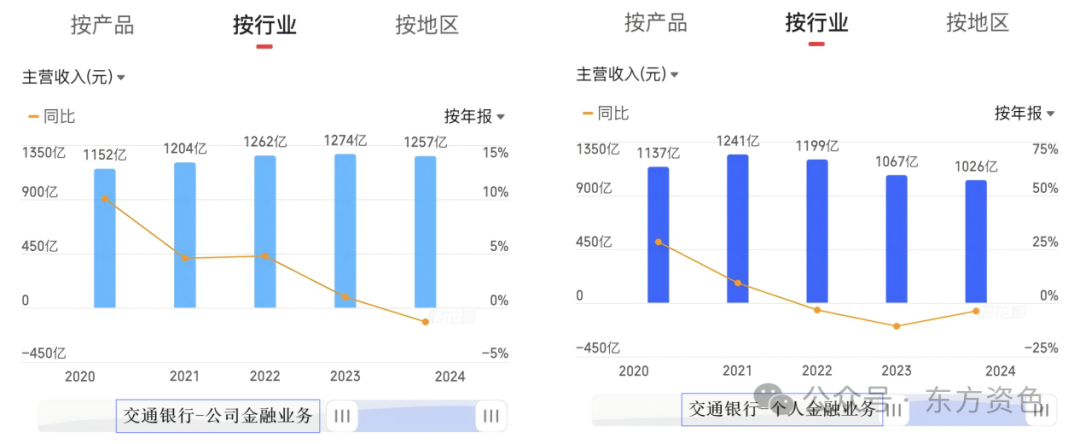 同时,交行的公司金融业务、个人金融业务两大基石业务合计贡献营收占比超八成。但在近五年,两大支柱业务同步失速,增速整体保持下滑态势。