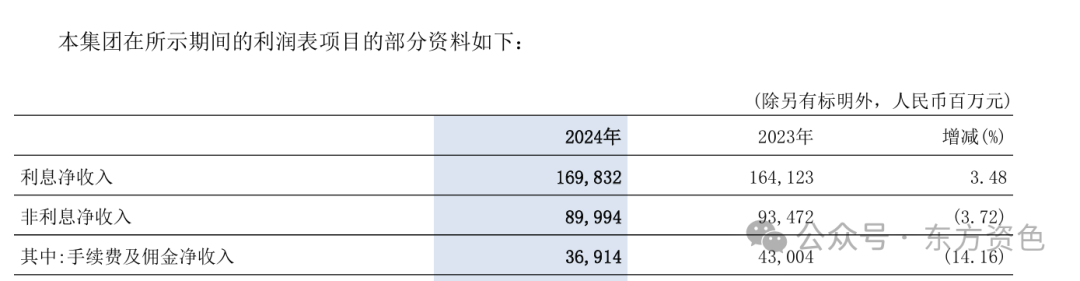 2024年,交通银行实现非利息净收入899.94亿元,同比下降为3.72%。其中,作为交通银行营业收入的重要组成部分,手续费及佣金净收入为369.14亿元,降幅达14.16%。